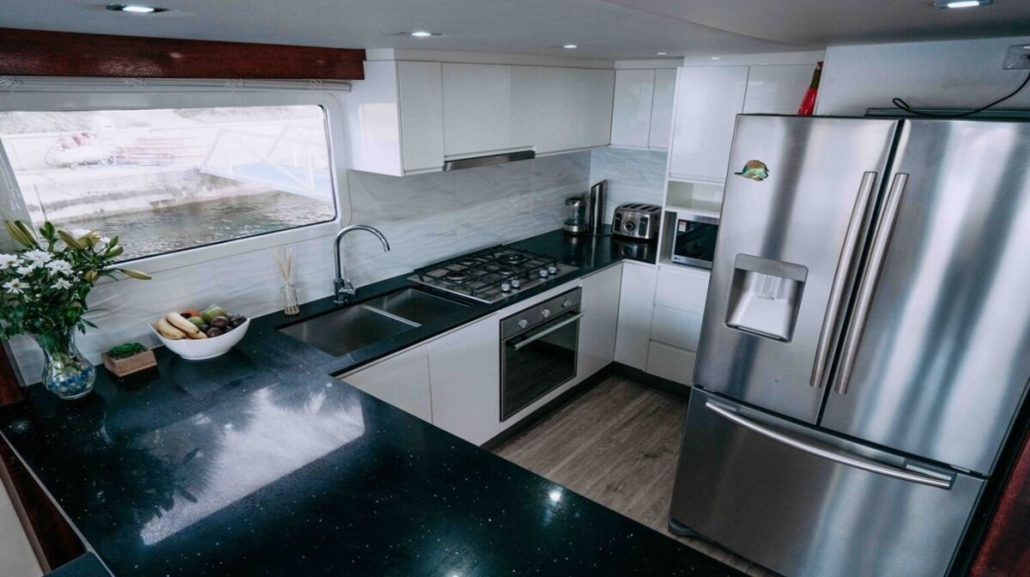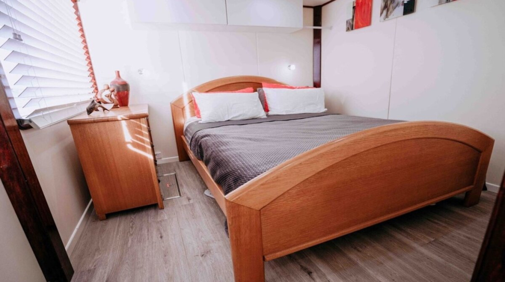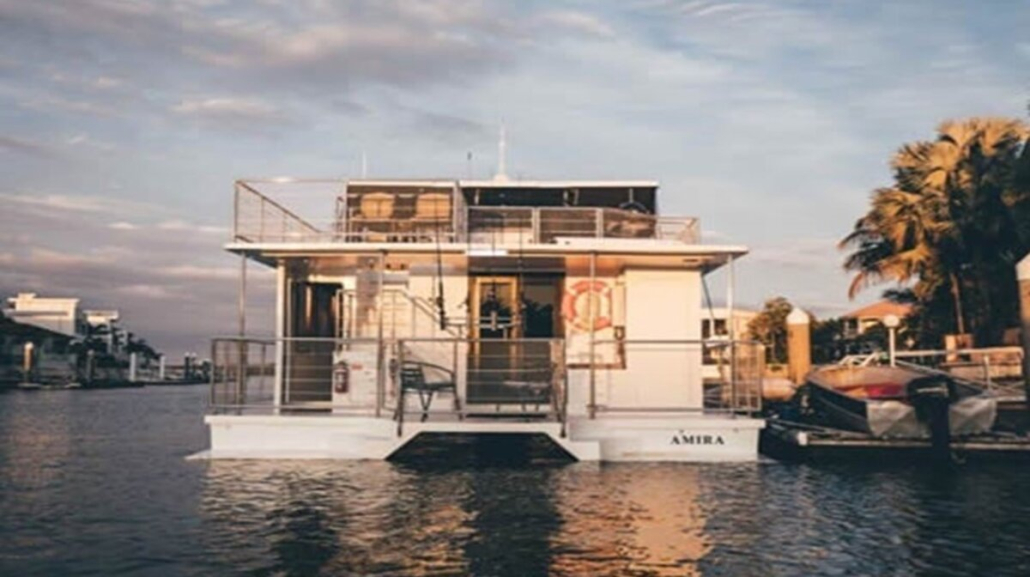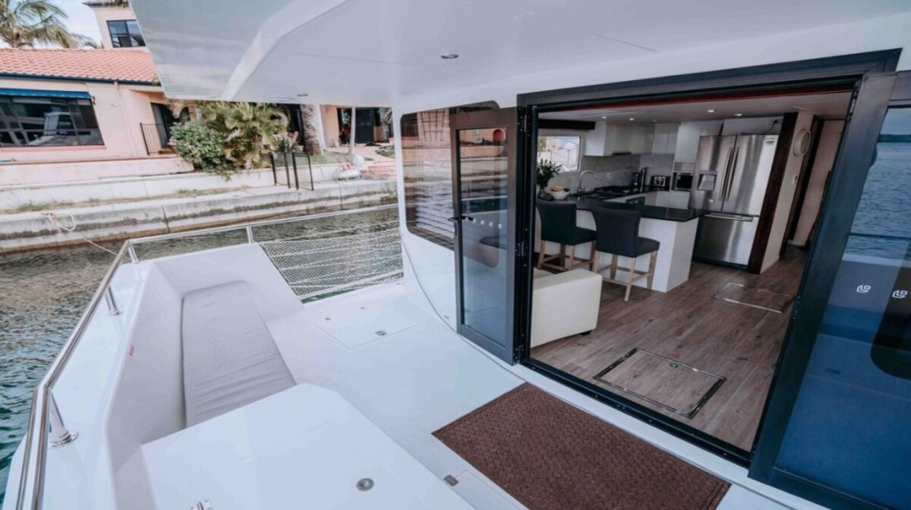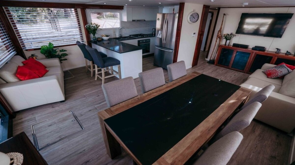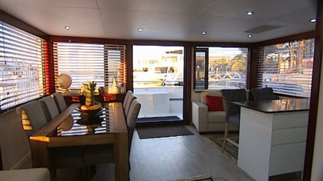 The layout of the houseboat has been designed for maximum relaxation and includes all the creature comforts of a luxurious home, including a fully equipped kitchen, TVs, outdoor spa, BBQ, air conditioning, washing machine and upstairs bar area.